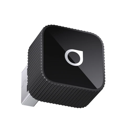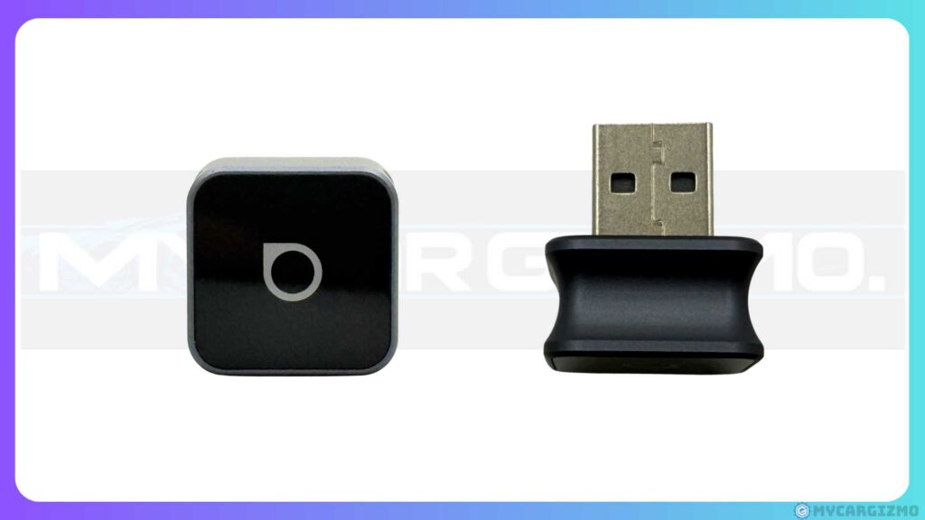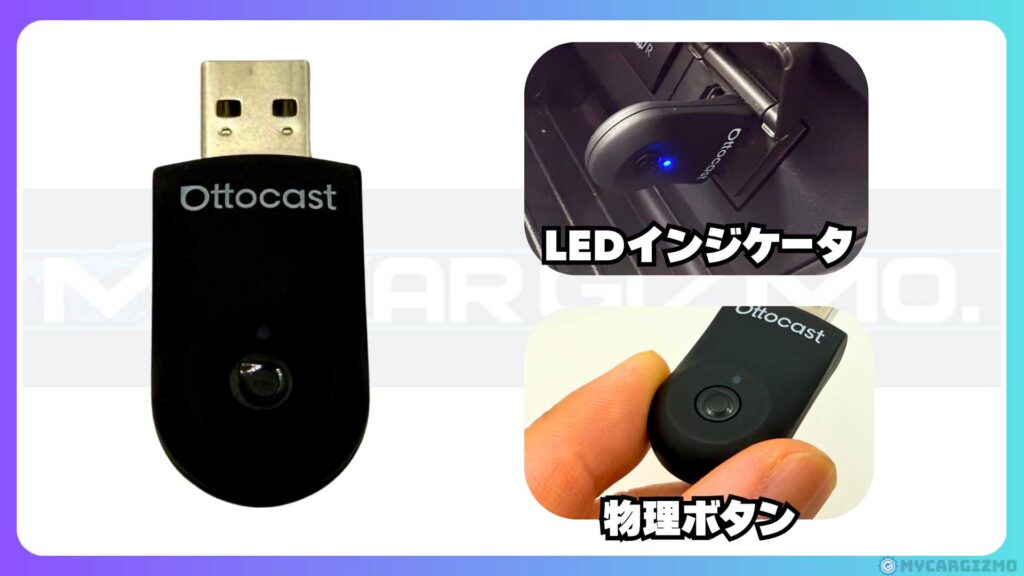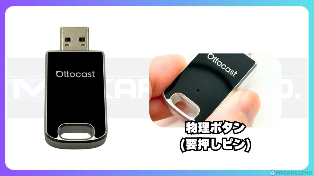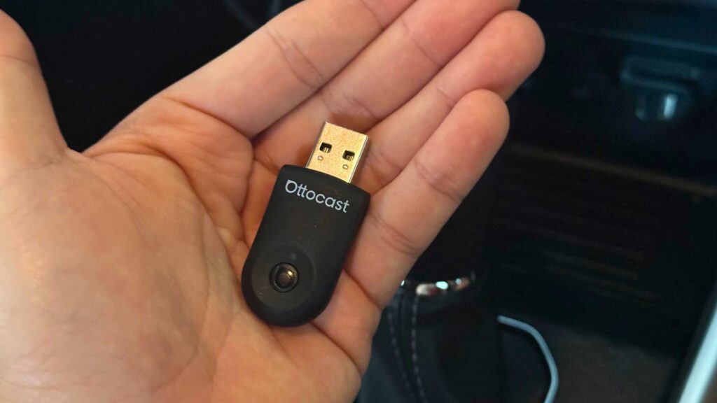OTTOCAST MINI本体は親指ほどのサイズの小型USBドングル形状で、車内インテリアに馴染むシンプルなデザインです。