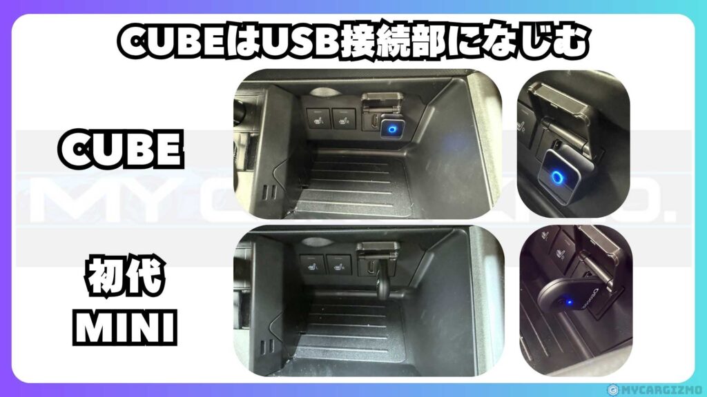 MINICUBE本体は四角い箱型の小型USBドングル形状で、車内インテリアに馴染むシンプルなデザインです。