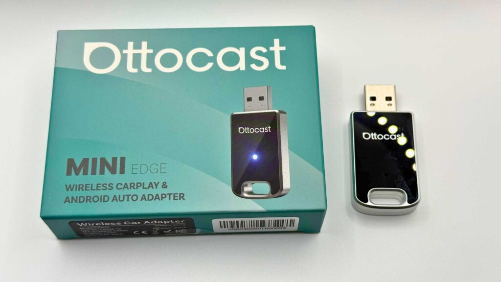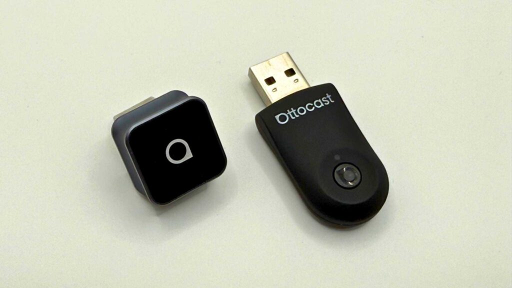 OTTOCAST MINI本体は親指ほどのサイズの小型USBドングル形状で、車内インテリアに馴染むシンプルなデザインです。