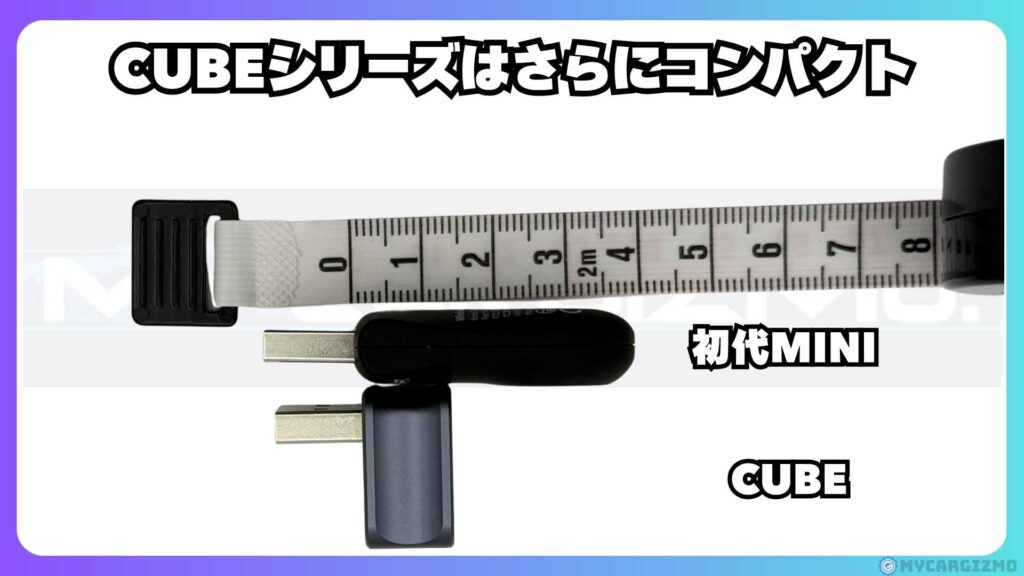 MINICUBE本体は四角い箱型の小型USBドングル形状で、車内インテリアに馴染むシンプルなデザインです。
