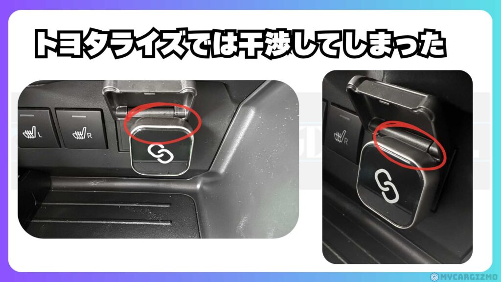類似品はUSB差し込み口から横に広がる形状ですが、これがライズのCarPlay用USB端子の保護カバーと干渉しちゃうんです。