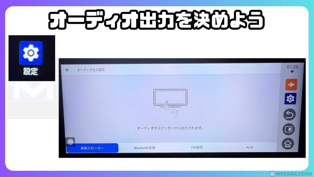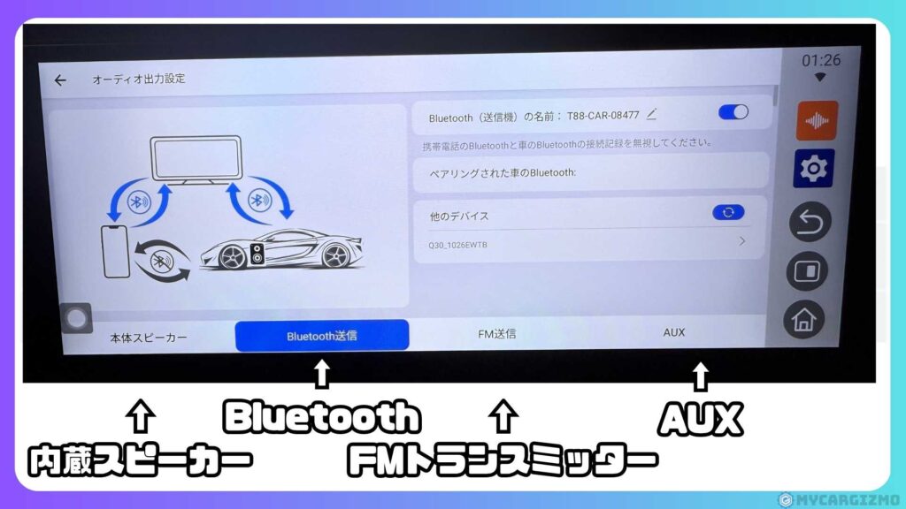 A. Bluetooth、AUX、FMトランスミッターの3パターンから選択できます。