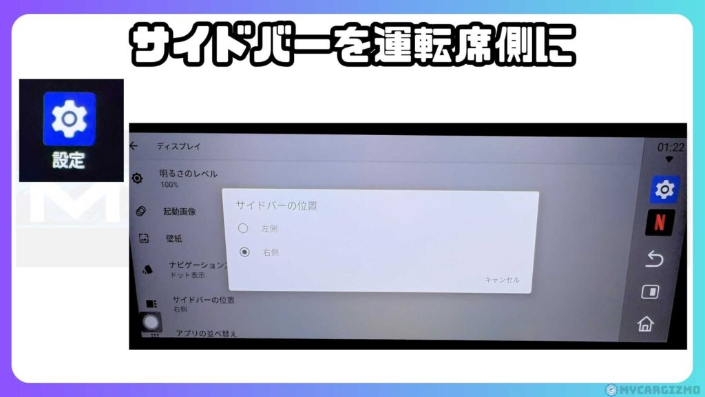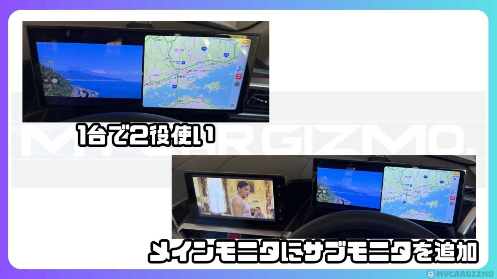 純正ナビ搭載車なら、メイン画面でカーナビ表示、サブ画面で動画アプリをさらに大きく表示するサブ機としても活躍します。